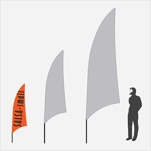 Beach flag SALSA Small je otisnut na vodootpornom poliesteru. Beach flag se jednostavno koristi i prenosi. Njegov privlačni oblik čini ga lako uočljivim. Osobito je učinkovit kod malih tvrtki kojima je potrebno veliko izlaganje.